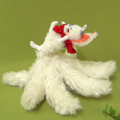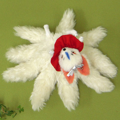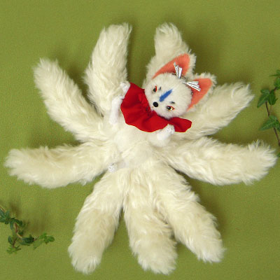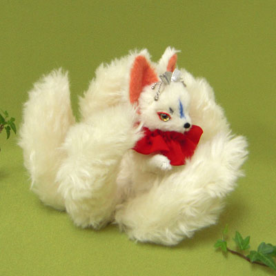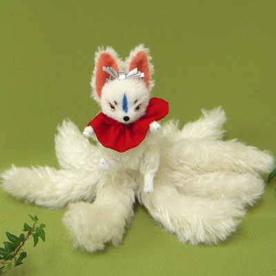 ”イラストのような狐のお面のようなお顔の九尾狐さん アレンジを加えて頂いて結構ですので なんとなくこんな感じの九尾狐さんをぜひぜひ・・・” というオーダーで、 送って頂いたイラストをもとに 制作致しました。 手持ちの狐のお面と一緒に、撮影してみました。